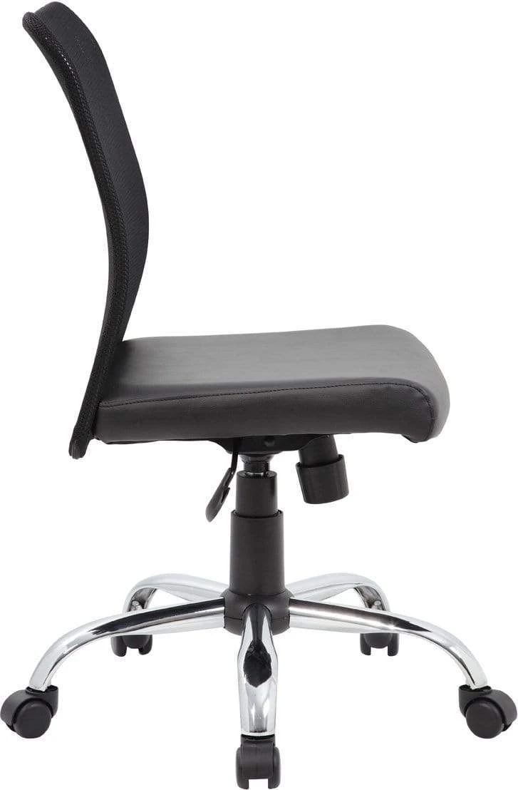 The budget mesh task chair is the perfect blend of a comfortable and professional design. The chair itself is created with a mesh backing for ultra-breathability, while the seat is designed with a solid, classy black vinyl. It also features a 25 inch chrome base with 2 inch nylon dual wheel casters for a smooth roll. The chair offers fantastic features such as a pneumatic gas lift that allows for easy adjustable height, as well offering a spring tilt mechanism, tilt tension and an upright lock.