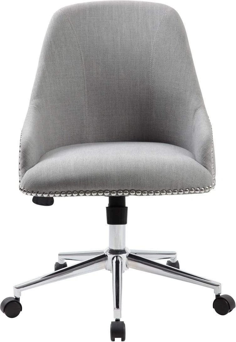 The Carnegie desk chair in grey is made from quality linen and features a gorgeous design utilizing nail head trim. It boasts a strong, sturdy high crown chair base in chrome with 2 inch nylon dual wheel casters for a smooth roll and the chair has a weight limit of 275 lbs. The chair features a spring tilt mechanism that changes the angle of the entire seat relative to the floor and allows one to transfer some of the upper body weight to the backrest of the chair. In addition to the spring tilt the chair has tilt tension, a pneumatic gas lift for easy height adjustments and an upright lock.