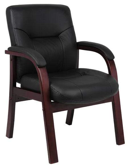 This executive leather guest chair is beautifully upholstered in genuine black Italian leather. Features built in lumbar support and rich mahogany finish hardwood arms and base with tailored leather padding to give your home or office a distinguished look. Meets and or exceeds ANSI/BIFMA standards.