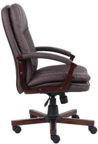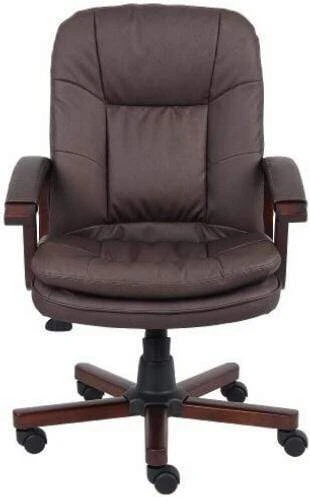 This mid back executive chair, from Boss Office Products, features beautifully upholstered Brown LeatherPlus. LeatherPlus is a leather infused polyurethane that offers maximum softness and commercial grade durability. Other features of this executive chair include double padded seat and backrest cushions, LeatherPlus padded wood loop arms, attractive Versailles cherry wood finish on both the base and arms, pneumatic seat height adjustment, spring tilt recline mechanism, 360 degree swivel, tilt with upright tilt lock, adjustable tilt tension control and a 27″ wood finish base with double wheel carpet casters. Meets or exceeds ANSI/BIFMA standards. Dimensions: Seat Size: 21.5″W x 19″D. Seat Height Adjustment: 18.5″ -21.5″H. Overall: 27″W x 29.5″D x 40.5-43.5″H. Six year limited warranty from