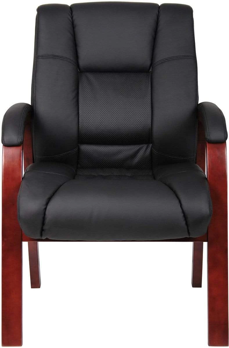 This gorgeous mid back guest chair pairs perfectly with our high and mid back executive chairs. Its distinctly modern design consists of beautiful Caressoft upholstery, plush Dacron filled top cushions with perforated centers, and cherry or mahogany finished wood. Caressoft is a soft material that has a durability similar to vinyl but the look and feel of leather with the added benefit of being easy to clean. Give your guests the next-level seating experience they deserve.
