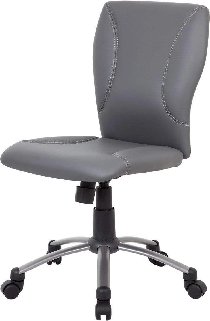 This Tiffany Modern Office Chair from Boss features a spring tilt mechanism. The spring tilt mechanism changes the angle of the entire seat relative to the floor and allows one to transfer some of the upper body weight to the backrest of the chair. It also boasts a sturdy 25 inch chrome base with 2 inch nylon dual wheel casters for a smooth roll and has a weight limit of 275 lbs. in addition to offering tilt tension, a pneumatic gas lift and an upright lock.