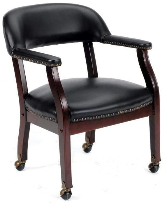 This elegant captain’s chair from Boss features classic traditional styling and charm. Features hand applied individual brass nail head trim all the way around the armrests and bottom of the seat and a no-sag spring seat. The sturdy hardwood frame is finished in a rich mahogany. Available in your choice of soft durable oxblood or black vinyl and also your choice of casters for mobility or without casters for stationary applications.