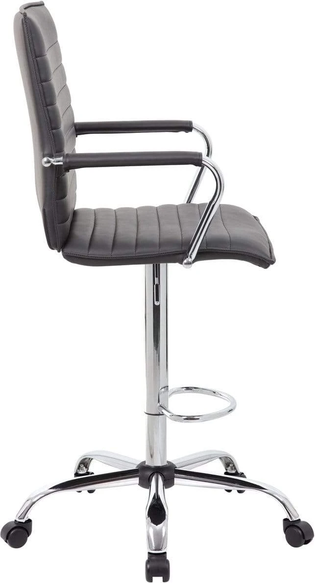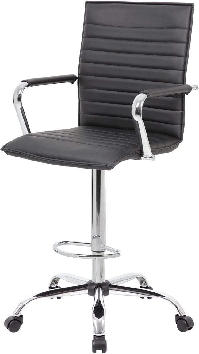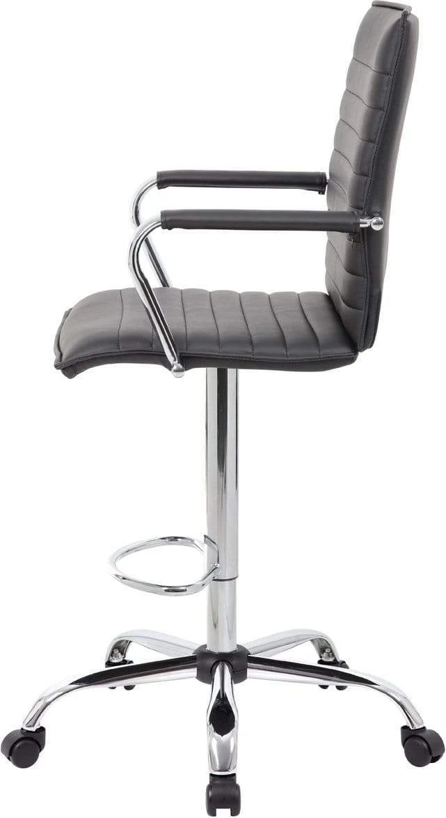 The ribbed design drafting stool comes in a lavish black vinyl material and is a comfortable seating option for most any office or studio. The drafting stool provides a pneumatic gas lift mechanism for adjustable height options, making this great for most any desk or drafting table. The stool also features a sturdy and fancy 27 inch chrome base with 2 inch nylon dual wheel casters for a smooth roll and has a weight limit of 275 lbs.