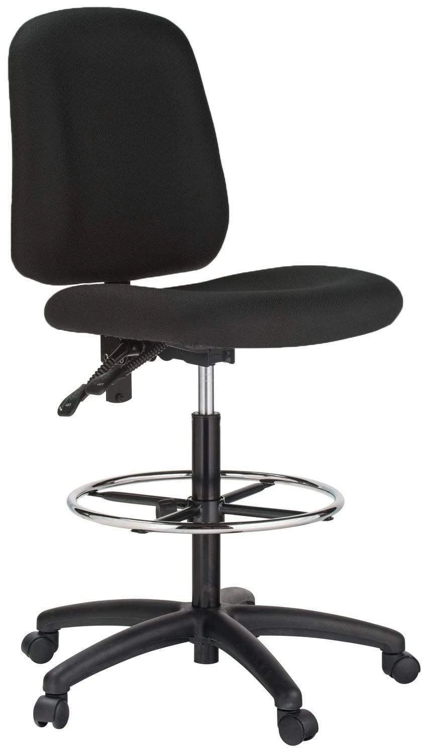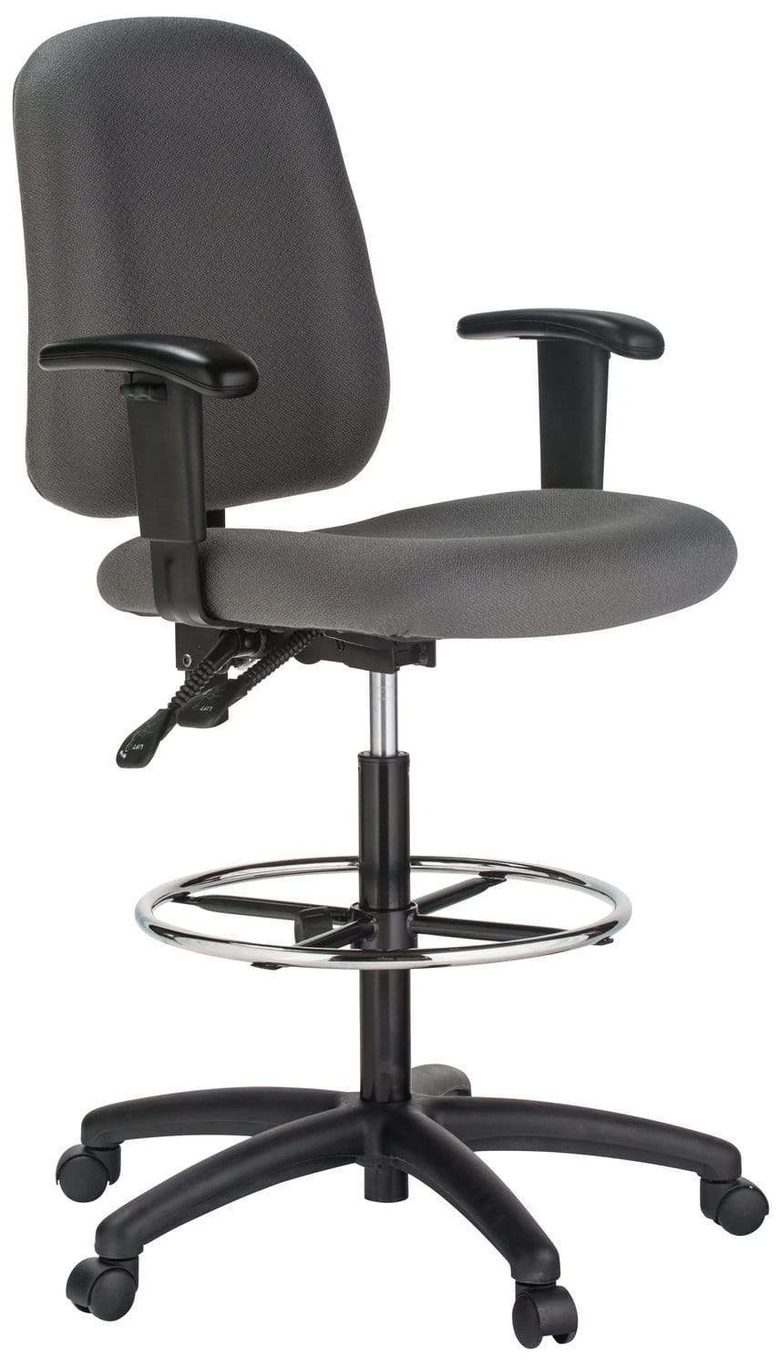 Other features include optional height and width adjustable armrests, one-touch pneumatic seat height adjustment, back height adjustment, back angle adjustment, 19″ adjustable height foot ring, and a heavy-duty five-star nylon base with dual-wheel casters.