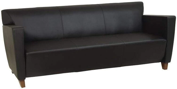 This modern styled box arm office sofa from Office Star Products features an extra wide seating area, thickly padded cushions, black bonded leather, solid wood legs in cherry finish, and a 15-year manufacturer’s warranty from Office Star.