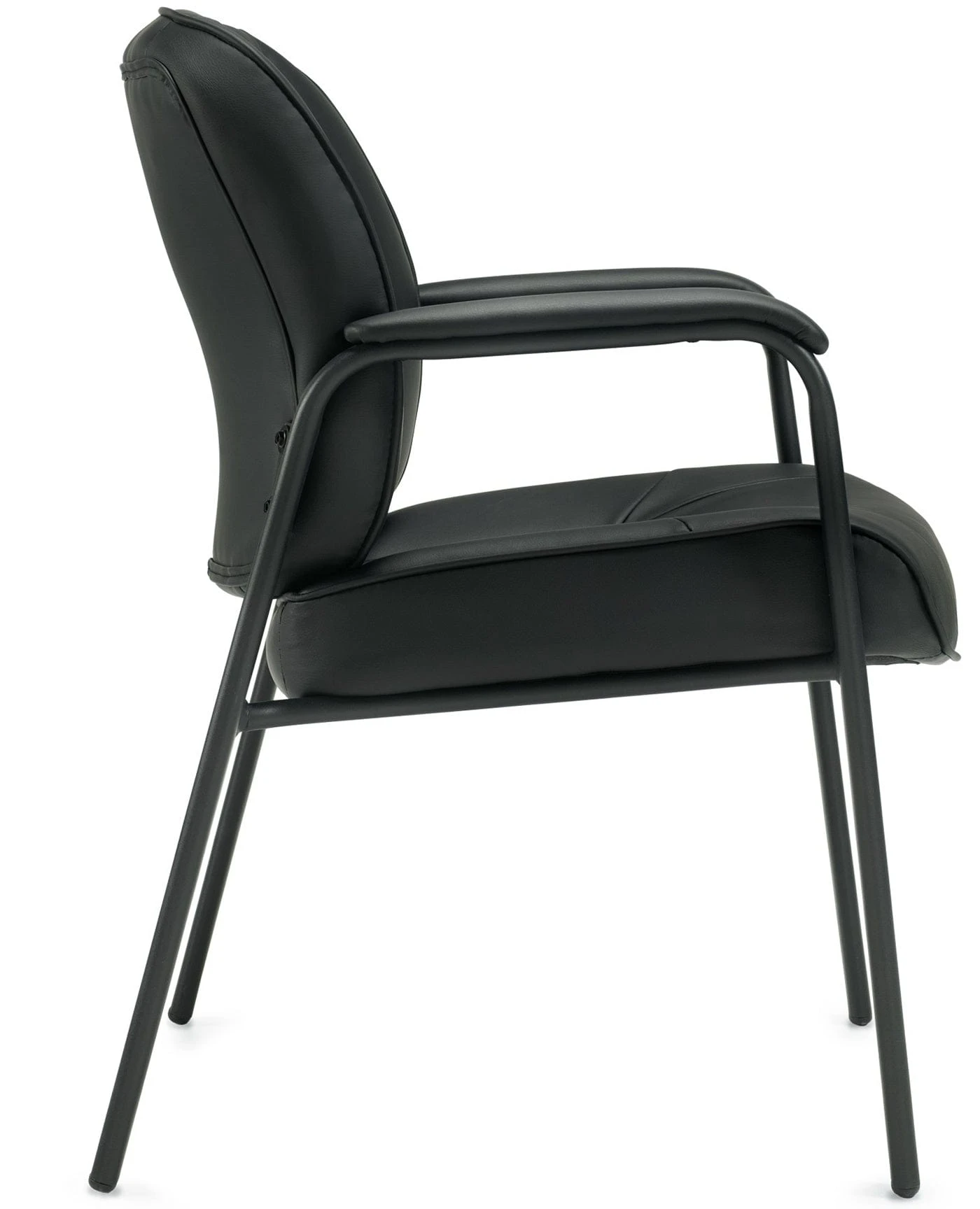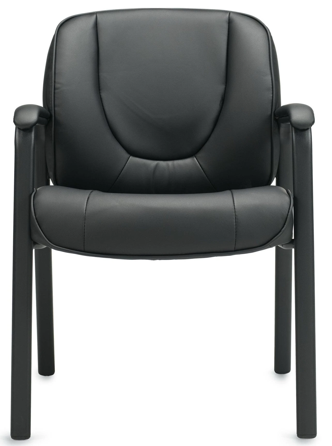 This guest chair from Offices To Go™ features attractive black Luxhide leather upholstery on all seated surfaces with matching mock leather trim on the outer edges. Luxhide leather is a bonded reconstituted leather consisting of genuine leather fibers combined with other materials for long-lasting durability.