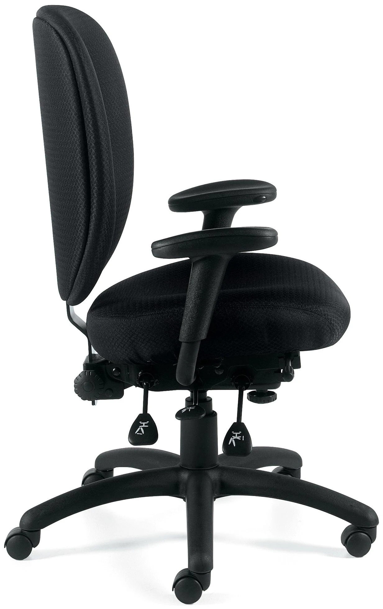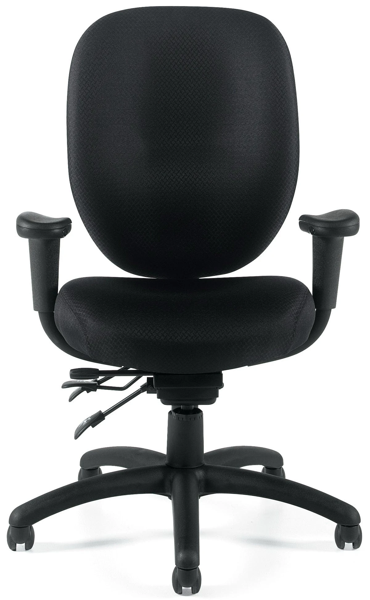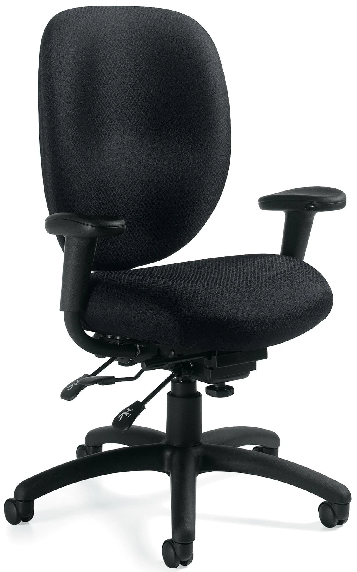 This multi-tilter ergonomic office chair from Offices To Go™ features thickly padded seat and backrest cushions upholstered in commercial-grade, stain-resistant black fabric. Other features include infinite locking seat tilt with tilt tension adjustment, back angle adjustment, forward tilt control, height adjustable armrests, 360-degree swivel, pneumatic seat height adjustment, and a scuff-resistant arched molded base with twin wheel carpet casters. This chair meets or exceeds ANSI/BIFMA standards.