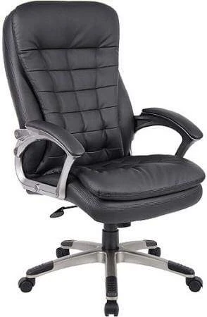 This high back executive chair from Boss Office Products features a patented ribbed, pillow top cushion over both the seat and backrest for maximum comfort. Other features include thick, molded foam cushions, durable yet soft faux leather CaressoftPlus upholstery, contemporary fixed position padded loop arms, elegant pewter finish on arm and base frames, pneumatic seat height adjustment, 360 degree swivel, tilt with upright tilt lock, adjustable tilt tension control and a heavy duty 27″ nylon base with anti-scuff tips and dual wheel carpet casters. Meets or exceeds ANSI/BIFMA standards. Dimensions: Back Size: 21″W x 29″H Seat Size: 21″W x 20″D. Seat Height Adjustment: 19.5″H – 22.5″H. Overall: 43.5″ – 46.5″H x 27″W x 31.5″D. Weight: 45 lbs. Six year limited warranty from